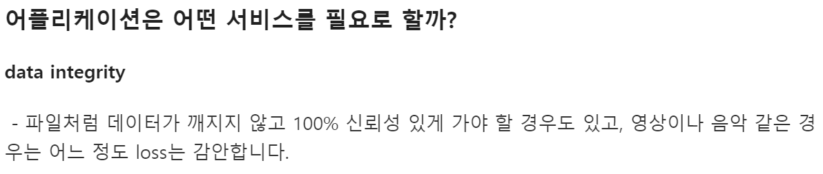 Application Layer 어떤 서비스를 사용하느냐에 따라 TCP를 사용할지 UDP를 사용할지 고민해볼 수 있습니다.